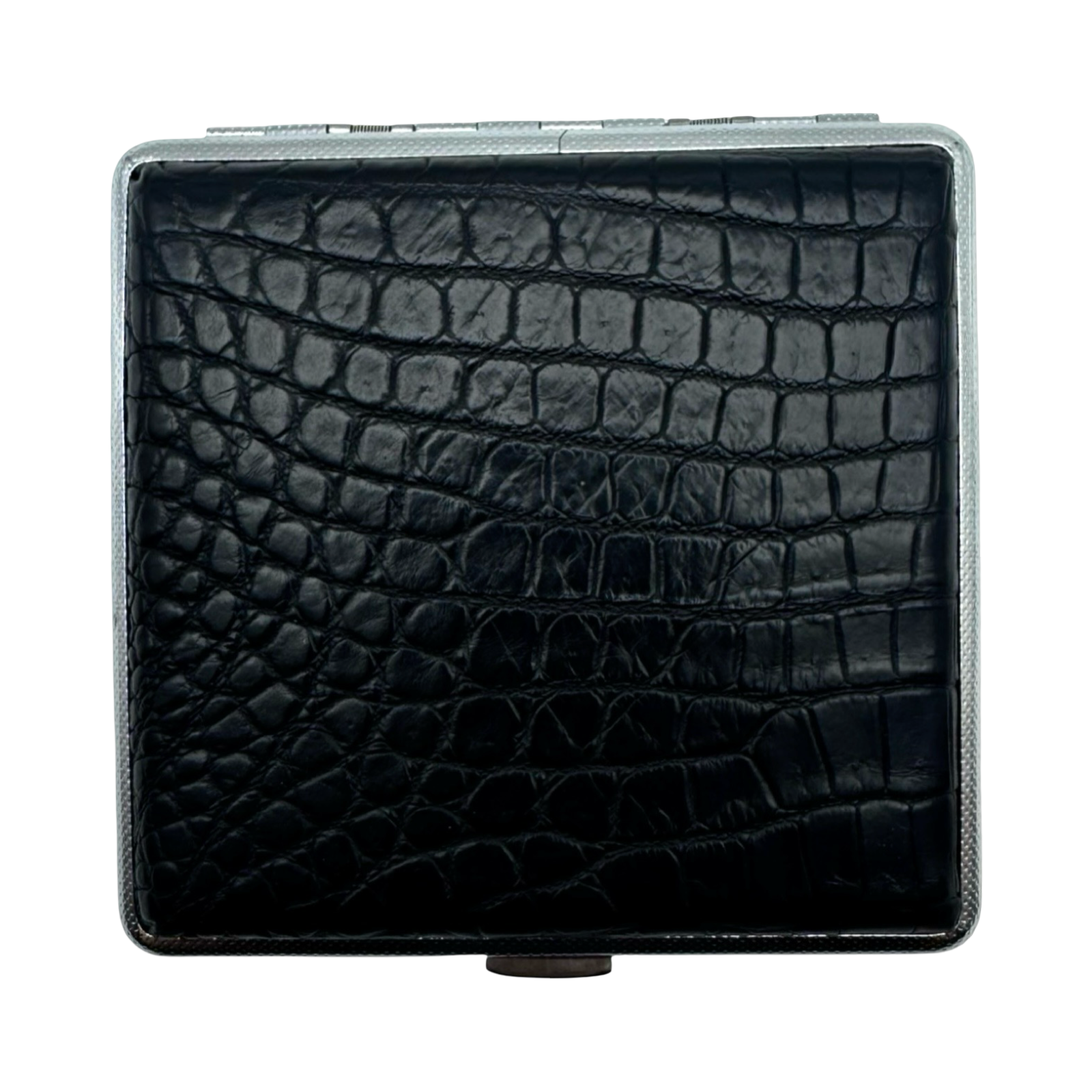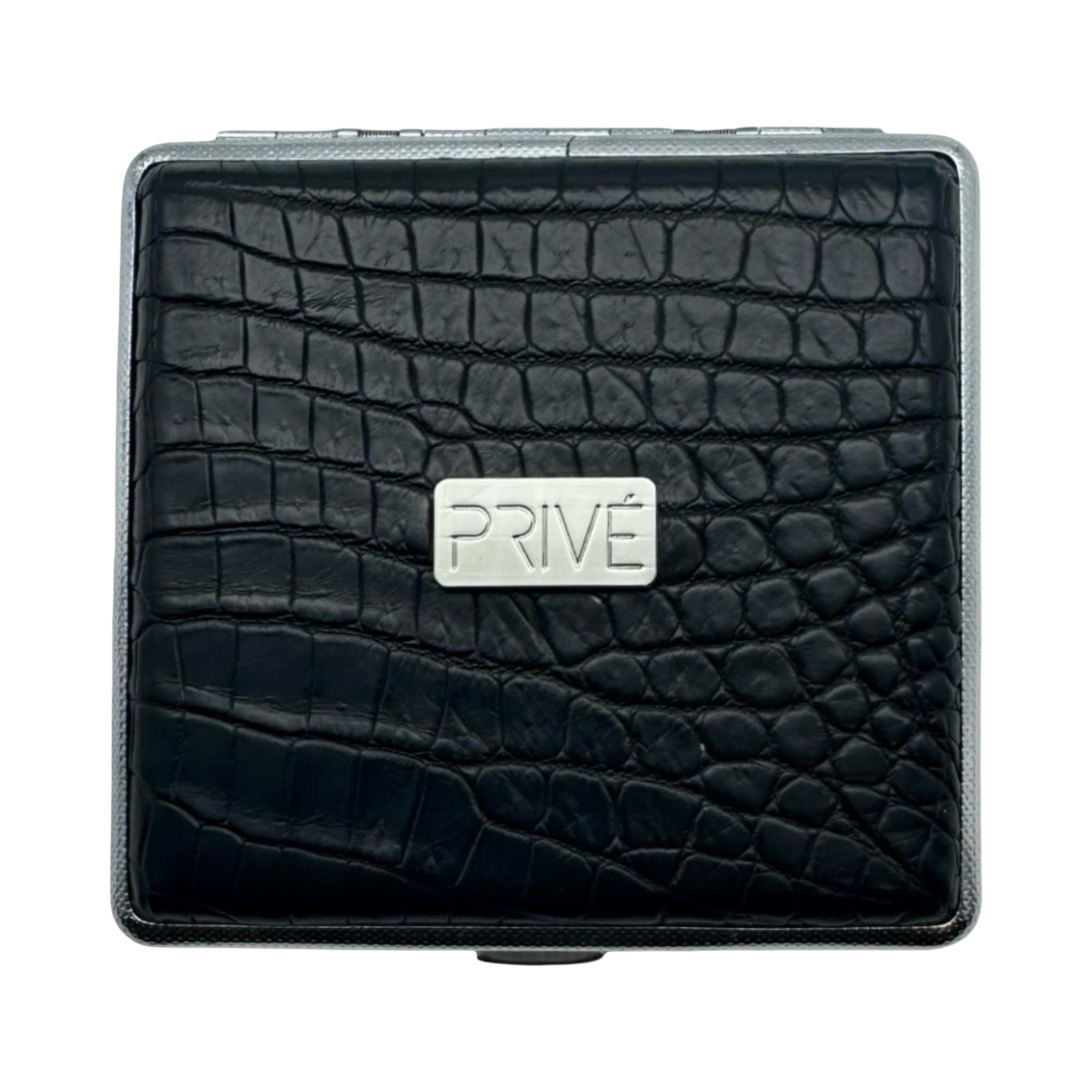 A meticulously crafted cigarette holder featuring a secure button closure and sleek silver-tone hardware. Wrapped on both sides in exclusive crocodile leather, this piece is finished with the signature PRIVE logo plaque at the center. Designed to carry cigarettes or small cigars, it combines practicality with refined elegance. Made in Italy.